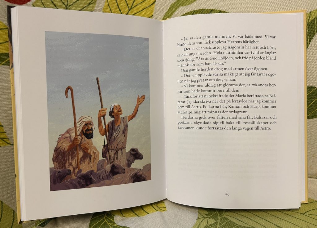 Boken kan läsas av 7-10-åringar på egen hand, eller som högläsning i familjen och då passar den även för yngre barn. Den är fint berättad, men griper inte riktigt ta i mig. Det blir mycket fokus på livet i Astro och resan till Betlehem, innan de verkligen får veta något om kungen som fötts, men den känslan av oviss förväntan kanske är bra för oss läsare att ha i adventstiden. Jag uppskattar den missionella prägeln på slutet av boken, där karaktärerna längtar efter att berätta för fler om kungen som fötts. Det blir en fin skildring av vad de vise männen kan ha gjort när de återvänt hem. Jag uppskattar också att boken lyfter karaktärernas tillbedjan och behov av Jesus, både barn och gamla, tjänare och herrar.