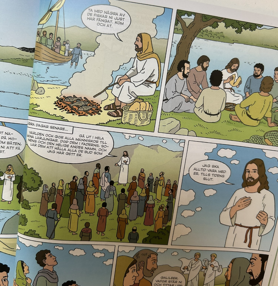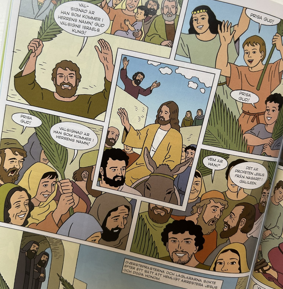 Är det som sägs pedagogiskt balanserat och välkommunicerat för barn? När man gör en barnbibel ska man inte bara vara trogen bibeltexten, man behöver också fundera på hur bibeltexten ska återges för målgruppen barn. Barn är åldersmässigt ett vitt begrepp, som jag redan nämnt. Om vi utgår från att målgruppen är mellanstadiebarn menar jag att de tecknade serierna på det stora hela är balanserat berättade. Men, kanske någon tänker, är det vist att visa bilder på soldater med svärd vid Herodes barnamord i Betlehem (s 34) och Petrus som hugger av örat på en soldat (s 115)? I det första fallet kanske jag själv inte skulle valt så explicita bilder, men kan samtidigt se en poäng i att prata med barn om att världsledare kan fatta otroligt ondskefulla beslut. I det andra fallet tillrättavisar Jesus direkt Petrus och helar soldaten, så Guds barmhärtighet mot fiender blir tydlig. Det är bra.